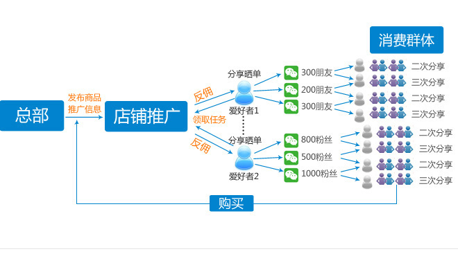 分銷平臺消費者即代理者,并且通過技術支持使平臺能夠實現統(tǒng)一的管理??梢园芽蛻?、好友和粉絲快速轉化為分銷商,一店變多店,引爆社交關系鏈。