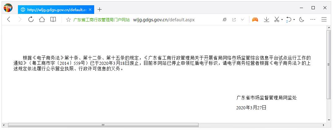 根據(jù)《電子商務(wù)法》第十條、第十二條、第十五條的規(guī)定,《廣東省工商行政管理局關(guān)于開展省局網(wǎng)絡(luò)市場監(jiān)管綜合信息平臺試點運行工作的通知》(粵工商市字〔2014〕559號)已于2020年3月18日廢止,目前本網(wǎng)站已停止申領(lǐng)紅盾電子標識,請電子商務(wù)經(jīng)營者根據(jù)《電子商務(wù)法》的上述規(guī)定依法履行公示營業(yè)執(zhí)照、行政許可信息的義務(wù)。